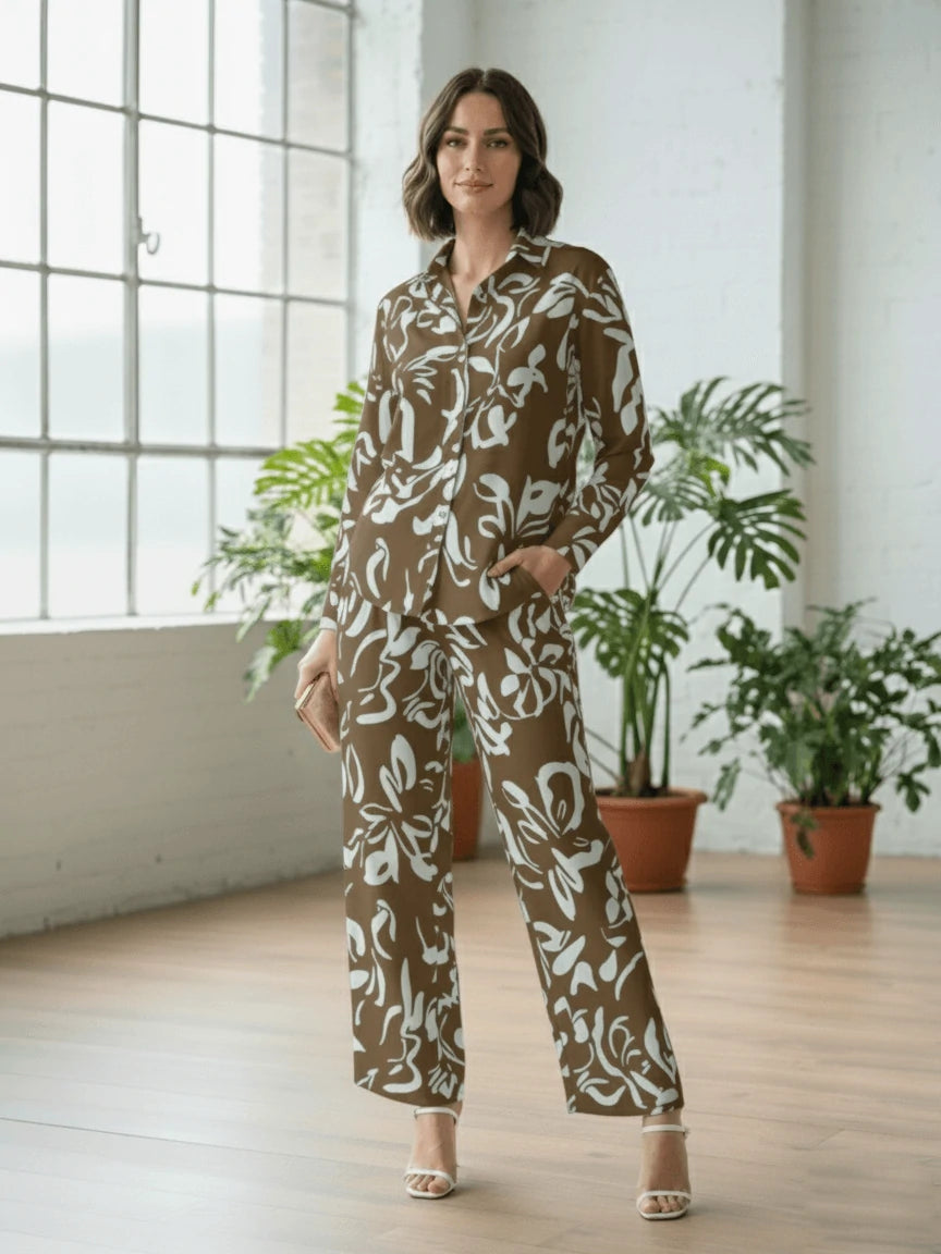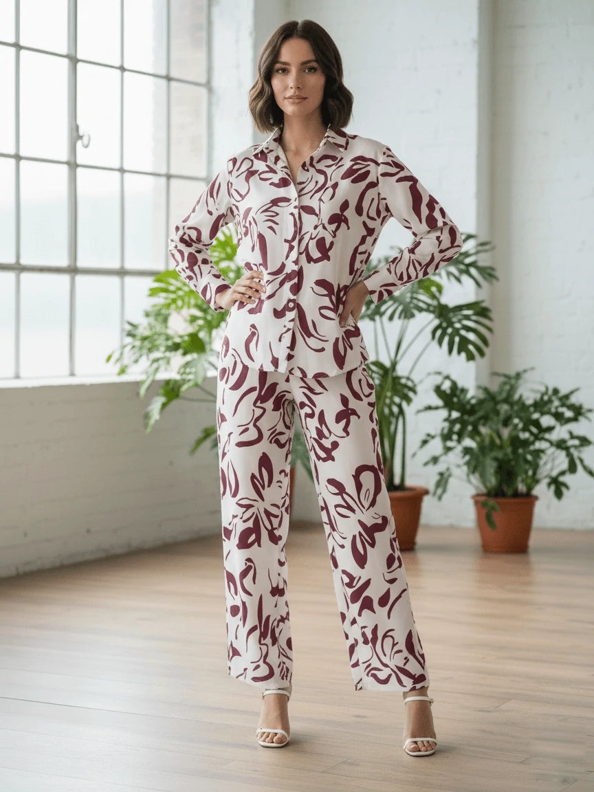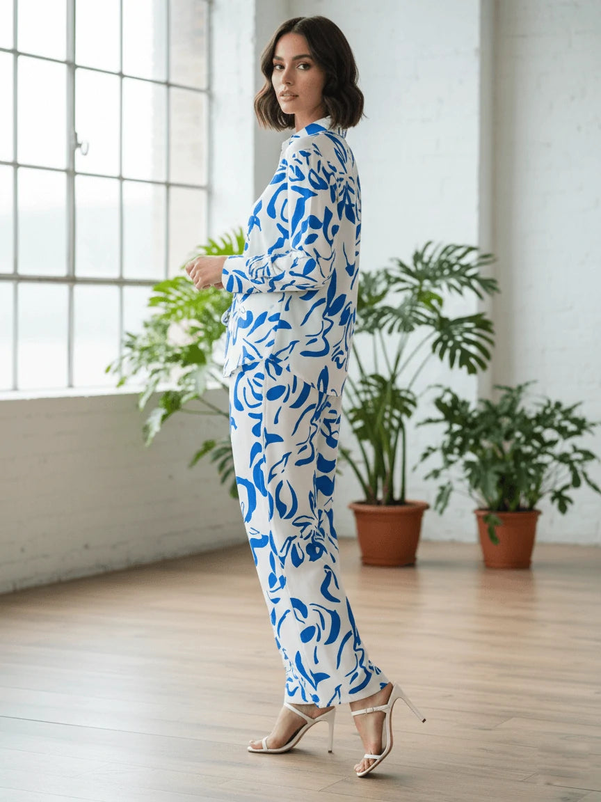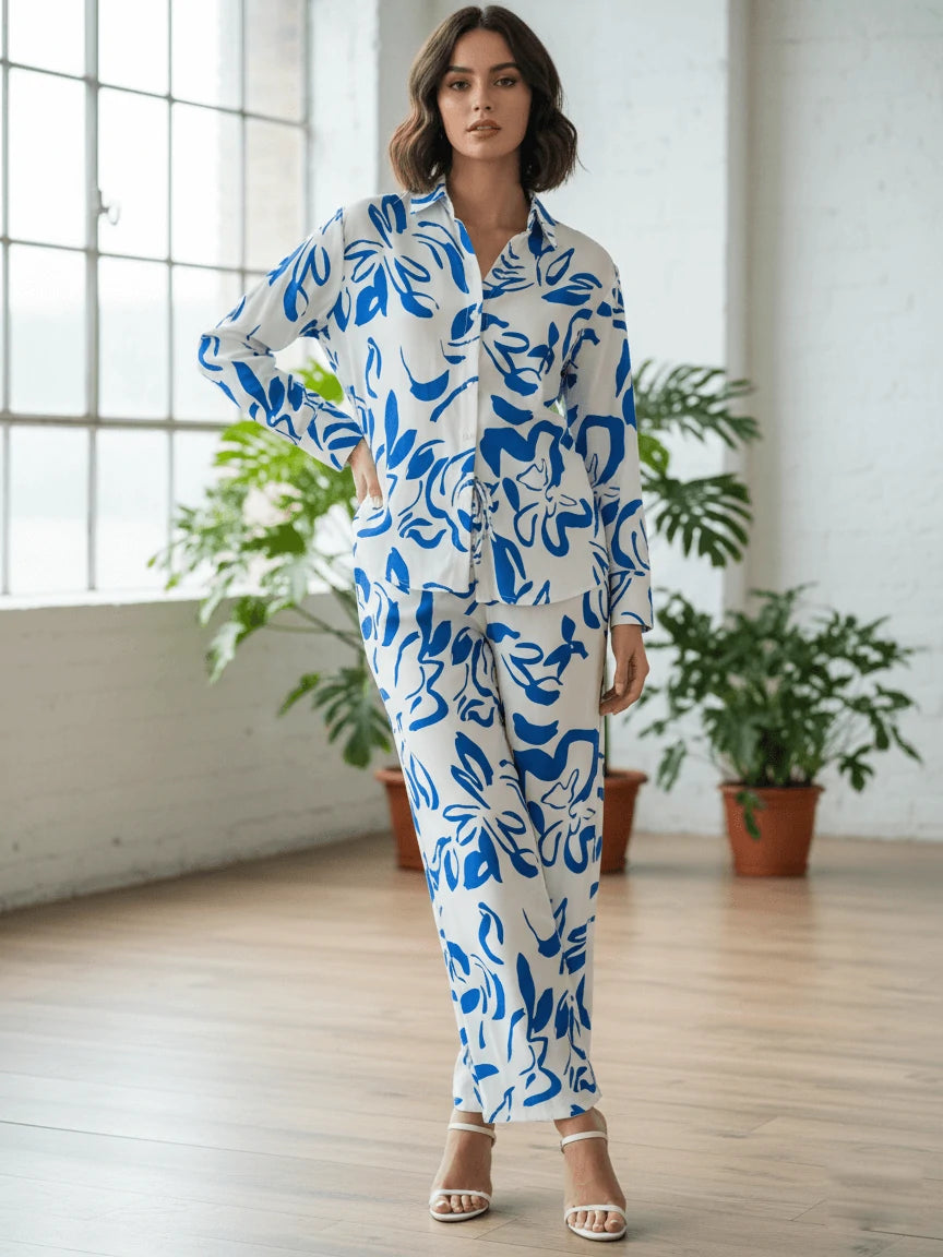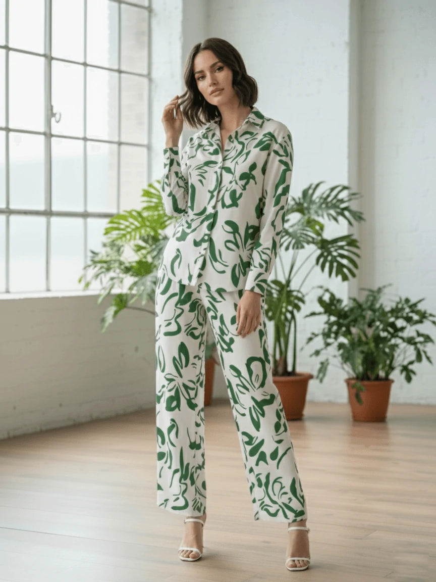 La chemise boutonnée, fluide et gracieuse, est sublimée par des imprimés artistiques audacieux, tandis que le pantalon ample allie confort et charme raffiné. Idéal pour les journées ensoleillées, les instants de détente élégante ou les sorties chics, cet ensemble incarne une féminité moderne et authentique.